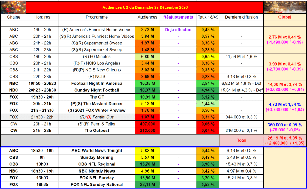 Le dimanche, c’est soit top, soit flop pour FOX en fonction de la NFL ou pas. Avec la NFL, la soirée de FOX est par conséquent bonne ici. Avec des programmes spéciaux par rapport à la semaine dernière.