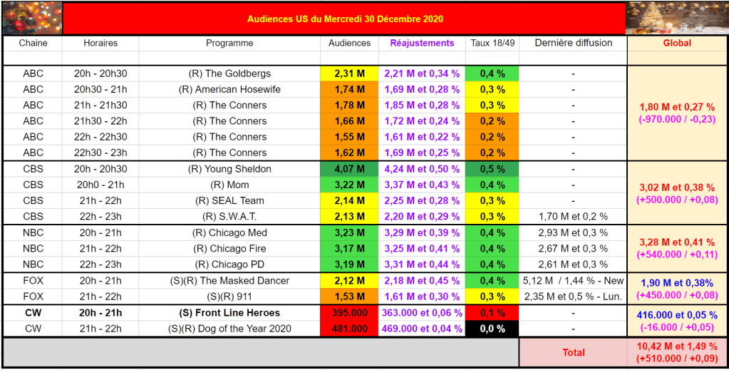 Sur CBS, les relances de sitcoms et séries rassemblent en moyenne 3,02 M et 0,38 %. Avec comme point culminant, Young Sheldon à 4,24 M et 0,50 % ; meilleure audience et meilleur taux de la soirée.