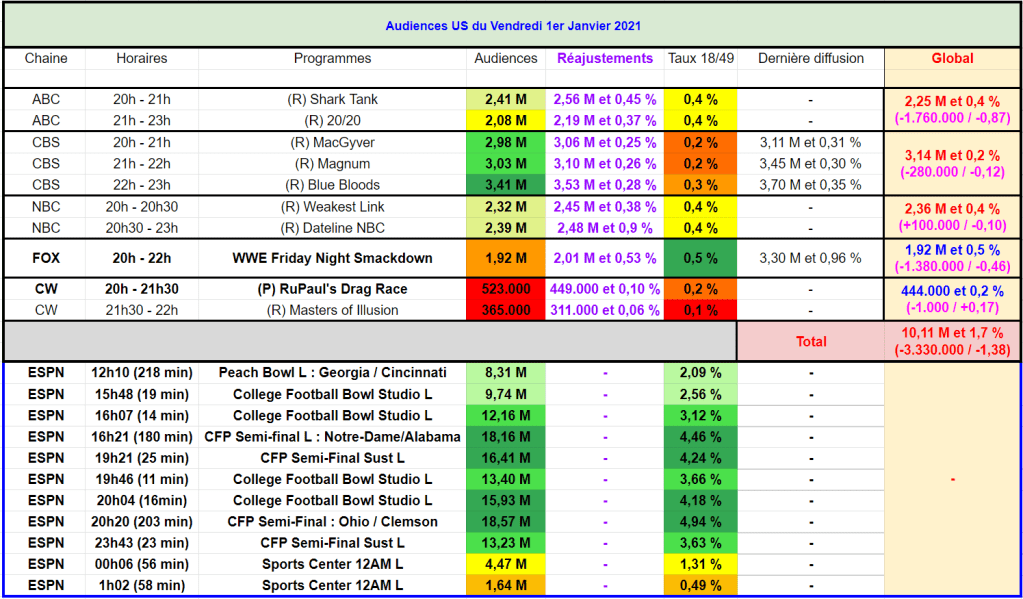 ESPN explose tout sur son passage, et se classe leader nationale sur de nombreux rdv en pulvérisant la concurrence, avec deux fois à plus de 18 M !!