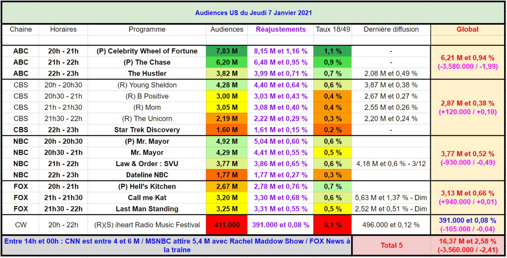 ABC lançait sa soirée jeu du Jeudi. Celebrity Wheel of Fortune a rassemblé 8,15 M et 1,16 % – Un excellent score, meilleure audience et meilleur taux de la soirée, très large et puissant leader.