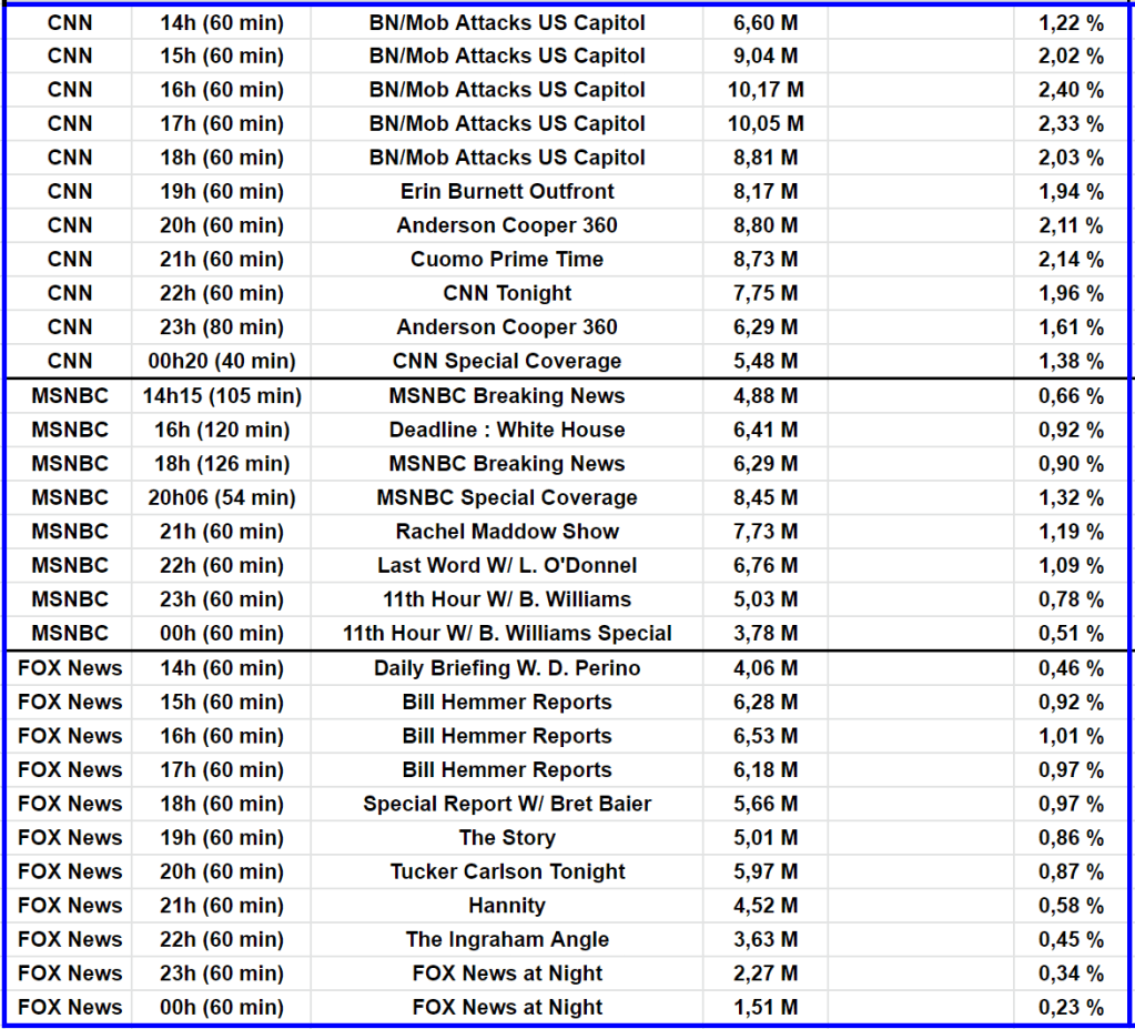 Avec les énormes scores de CNN souvent entre 8 et 10 M !! Egalement d’excellent score pour MSNBC à plus de 7 M en prime.