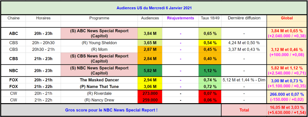 Programmation spéciale en ce mercredi soir avec la forte actualité après l’attaque du Capitole, les chaines américaines ont bouleversé leurs programmes et sont passées en Special Report.