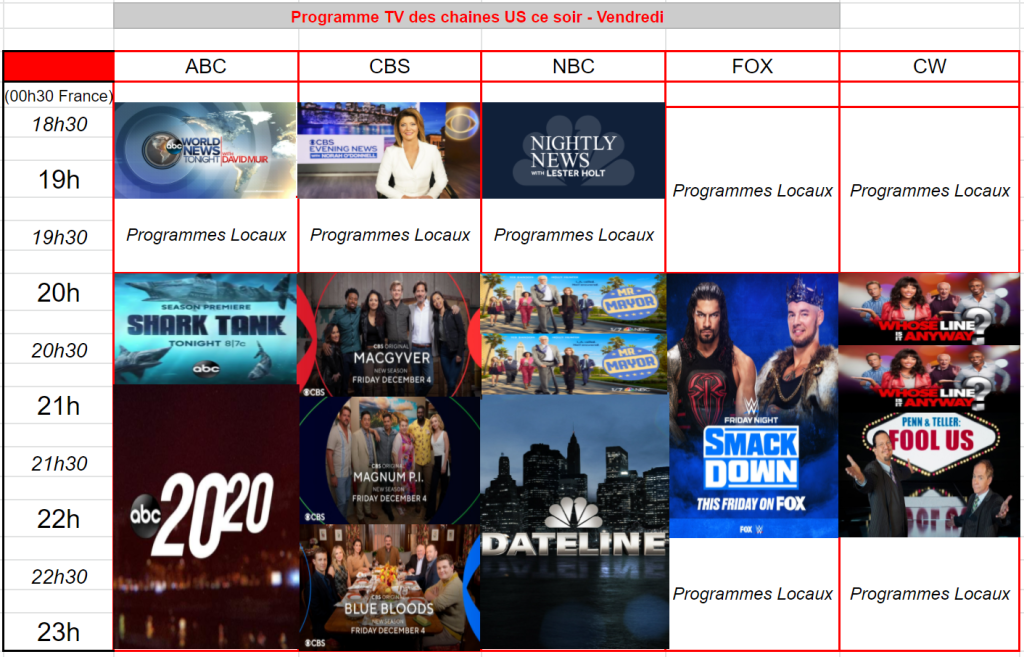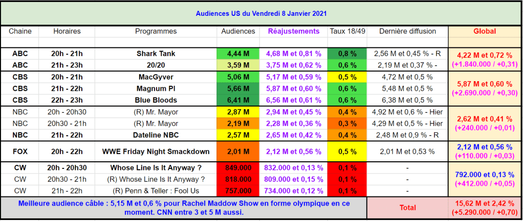 Sur CBS, les séries du vendredi sont toujours lancées à plein régime et rien ne les arrête. Record en nombre de téléspectateurs et sur taux pour MacGyver avec 5,17 M et 0,59 %. Magnum PI signe un record de saison en téléspectateurs et sur le taux avec 5,87 M et 0,60 %. Et pour finir record de saison sur les deux indicateurs pour Blue Bloods à 6,56 M et 0,61 %. Toutes les séries sont leader en audience.