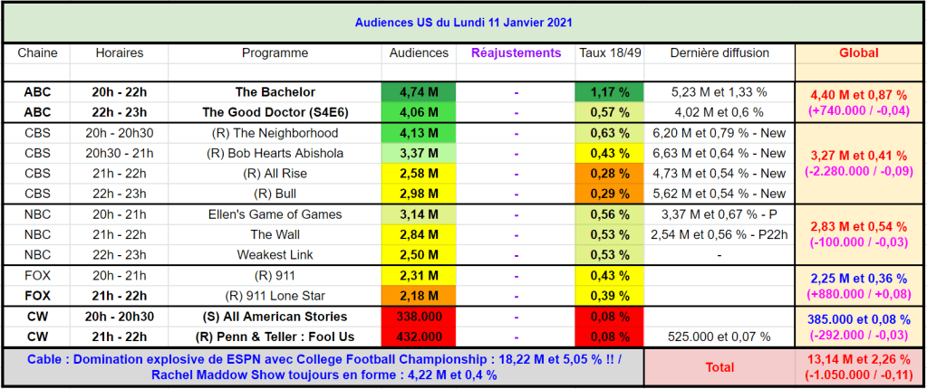 La soirée jeu de NBC n’est pas le top des audiences on va dire. Elle rassemble 2,83 M et 0,54 M en moyenne. C’est pas mauvais, mais c’est pas excellent non plus. NBC est derrière ABC et CBS en audience.