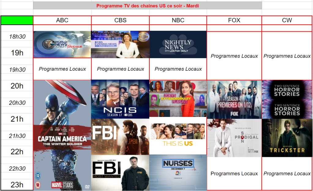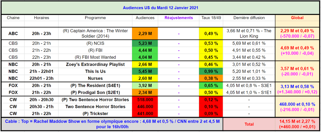 Sur CBS, le trio de série est toujours au top du top, même en relance avec 5,23 M et 0,53 % pour NCIS puis 4,44 M et 0,50 % pour FBI et 4,04 M et 0,45 % pour FBI Most Wanted. Excellente soirée.