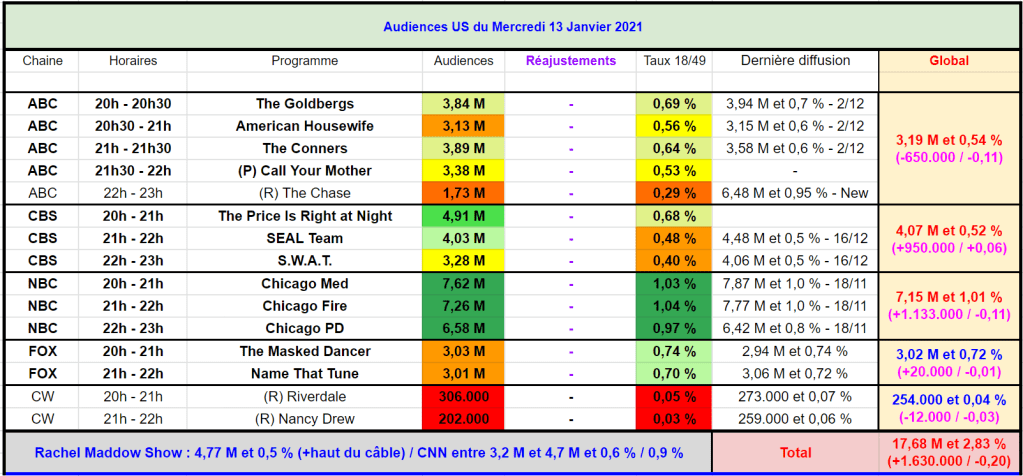 Sur ABC, The Goldbergs signe un retour presque stable à 3,84 M et 0,69 %. American Housewife est de retour stable aussi à 3,13 M et 0,56 %. The Conners en revanche est de retour en hausse avec 3,89 et 0,64 %.