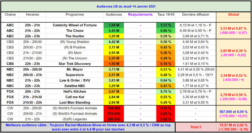Sur ABC, bien qu’en baisse, le bloc jeu reste bien suivi. Wheel of Fortune attire 7,84 M et 1,17 %. Excellent score avec la meilleure audience et le meilleur taux de la soirée. Très large leader.