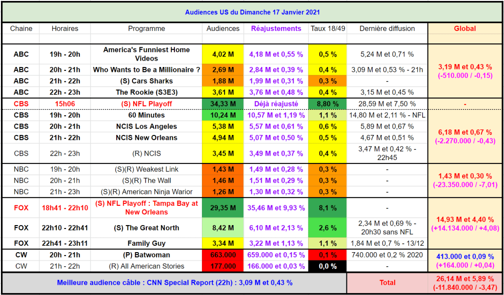 Sur CBS, dans l’après-midi, la NFL est très haute avec 34,33 M et 8,80 % ! Enorme !