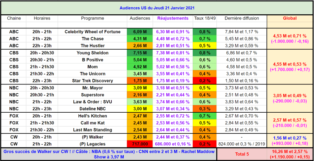 Sur NBC, Mr Mayor est aussi en forte baisse à 20h avec 3,09 M et 0,5 % ; perdant près de 600.000 en 1 semaine. Superstore – déjà faible – est en baisse à seulement 2,16 M et 0,4 % et signe ses scores les plus bas.