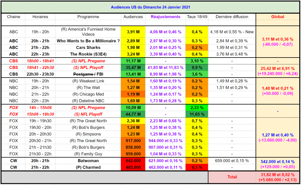 Sur CBS – soirée spéciale par rapport aux dimanches traditionnels. De 18h41 à 22h30, la NFL a rassemblé 41,85 M et 11,83 % sur le taux ! C’est énorme comme score ! CBS pulvérise la concurrence !