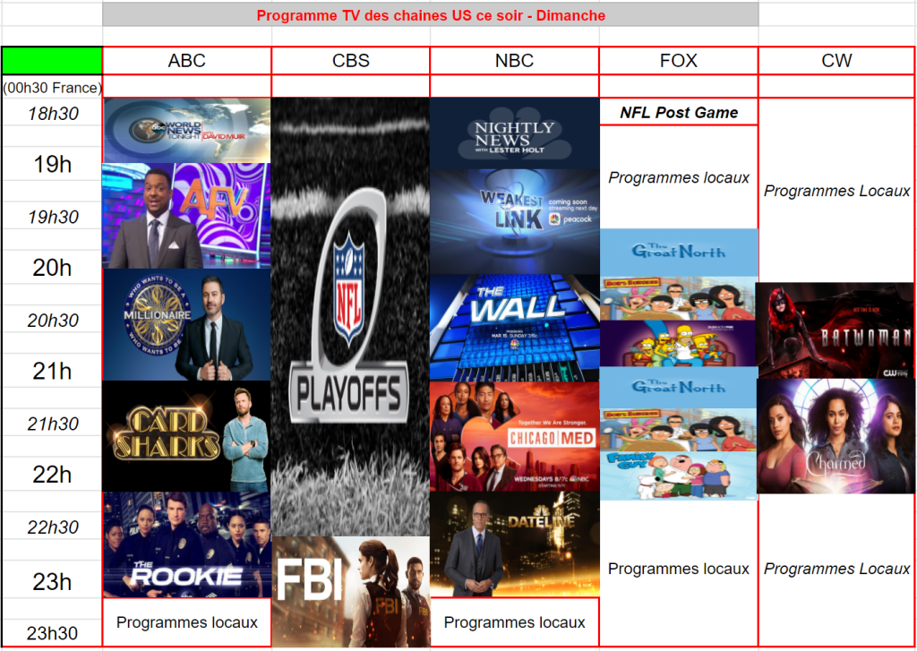 La soirée du dimanche est très compliquée pour NBC sans la NFL. La chaine rassemble en moyenne 1,48 M et 0,21 % sur son 19h/23h.