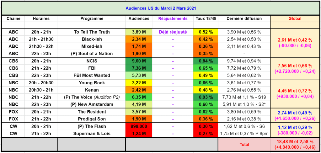 Sur NBC, Young Rock est encore en baisse avec 3,22 M et 0,66 % – Mais reste bon sur cible. L’autre sitcom est elle aussi en baisse avec 2,42 M et 0,48 % – Il faut faire attention.