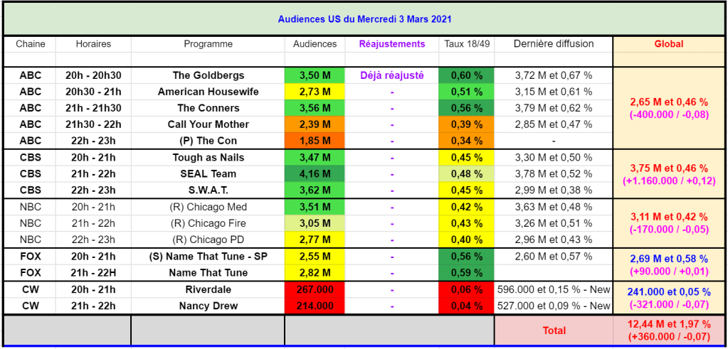 En ce mercredi, les sitcom de ABC ne sont pas en forme, elles perdent tous entre 200.000 et 500.000 sur une semaine.