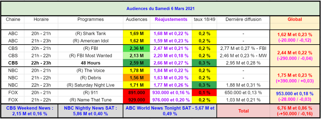 Le reste de la soirée de CBS est à 2,20 M et 2,47 M
