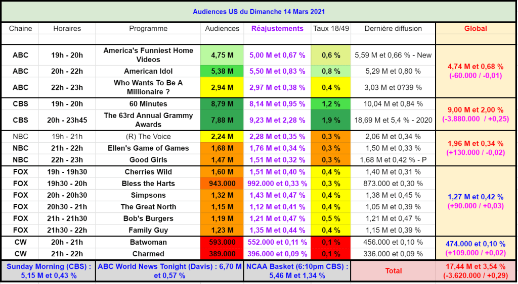 Même en rediffusion, AFV est très fort sur ABC avec 5,00 M et 0,67 %. American Idol, avec 5,50 M et 0,83 %, est en hausse sur une semaine (face à Oprah, Meghan et Harry).