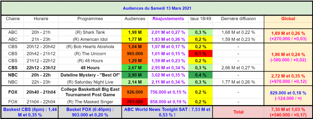 Le JT de ABC, présenté par Whit Johnson, est très haut avec 7,53 M et 0,53 % !