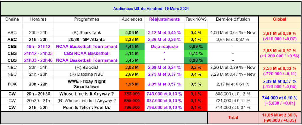 Ensuite sur CBS, le tournoi NCAA Basketball a attiré 4,44 M et 0,99 % pour le match de 7pm et 3,45 M et 0,98 % pour celui de 9:33pm –