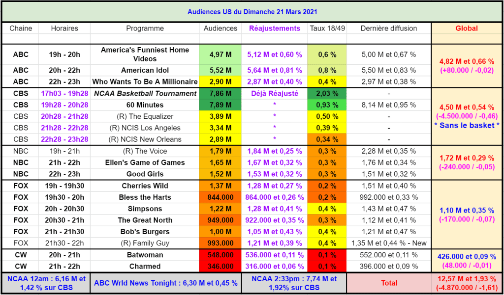 On commence par les match de NCAA Basketball sur CBS. Le match de 12am rassemble 6,16 M et 1,42 % -Celui de 2:33pm captive 7,74 M et 1,92 % et celui de 5:03pm a rassemblé 7,86 M et 2,03 %