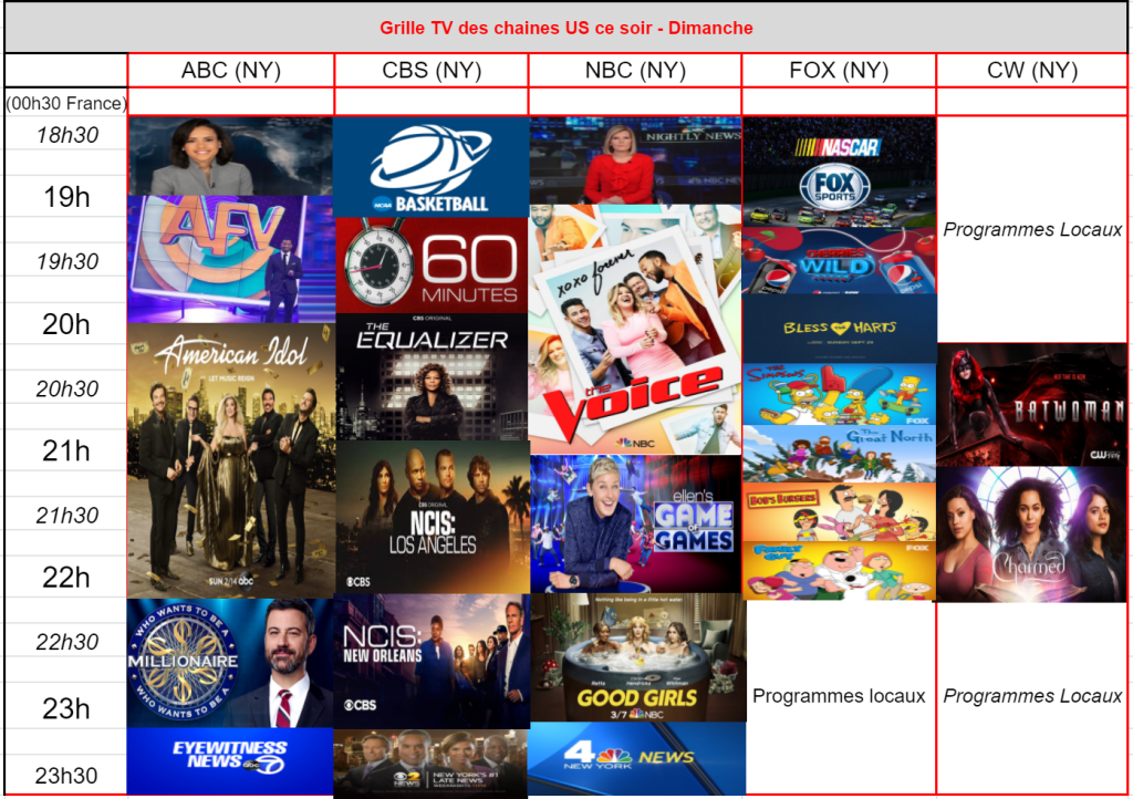 Les relances pénalisent la soirée de CBS – qi reste bonne quand même – avec 3,89 M / 3,34 M / 2,89 M – CBS perd le leadership du dimanche, tenu depuis 8 semaines consécutives !