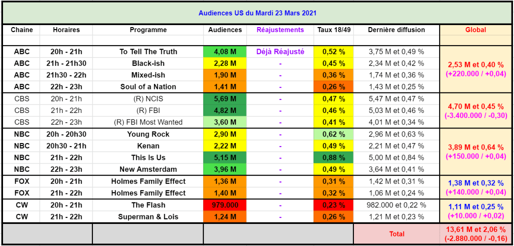 Sur CBS, Young Rock (2,90 M et 0,62 %) et Kenan (2,22 M et 0,49 %) sont toujours à des niveaux moyens.