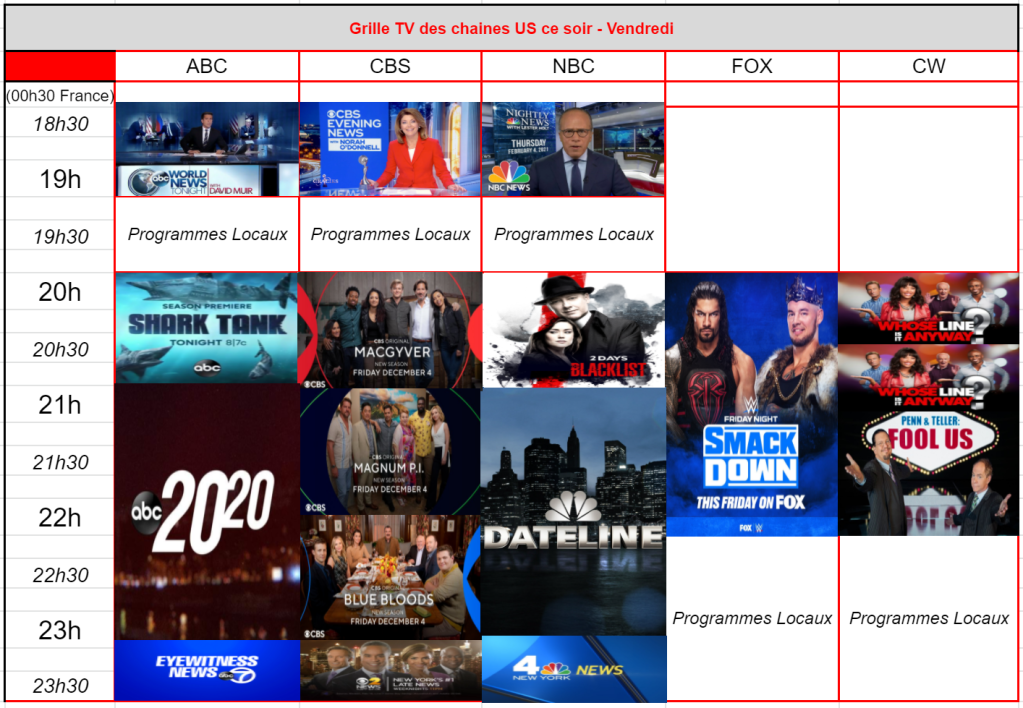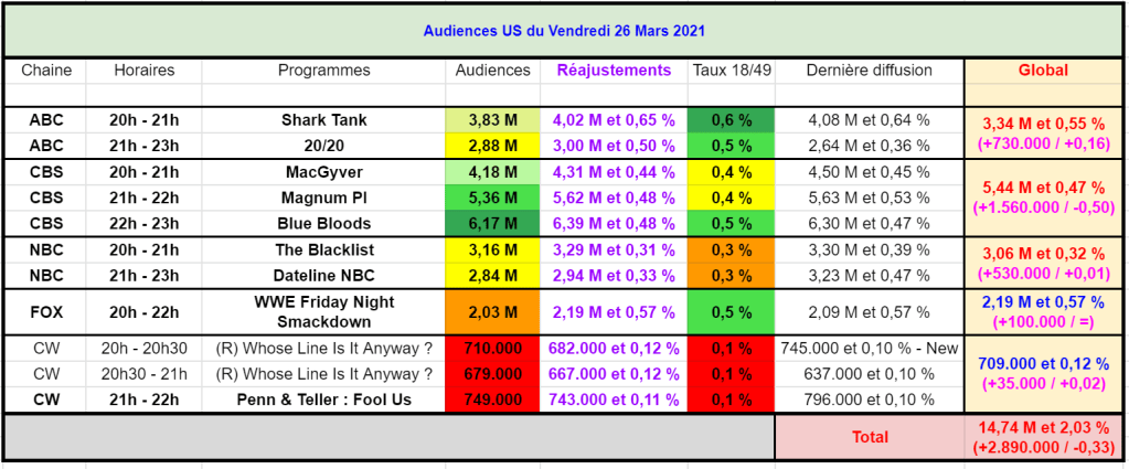 Le trio de séries de CBS domine la soirée en audience avec 4,31 M pour MacGyver ; 5,62 M pour Magnum et 6,39 M pour Blue Bloods – Meilleure audience de la soirée.