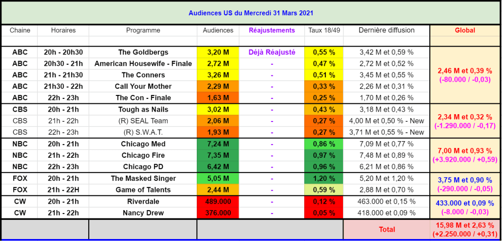 La relance de SEAL Team assemble 2,06 M et 0,27 % et celle de SWAT est à 1,93 M et 0,27 % (+300.000 sur ABC)
