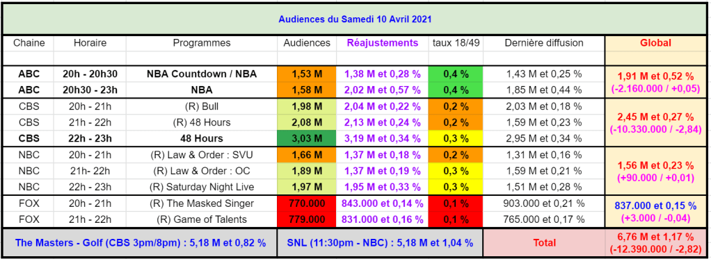 Masters sur CBS attirent 5,18 M et 0,82 % – SNL à 23h30 sur NBC est à 5,18 M et 1,04 %