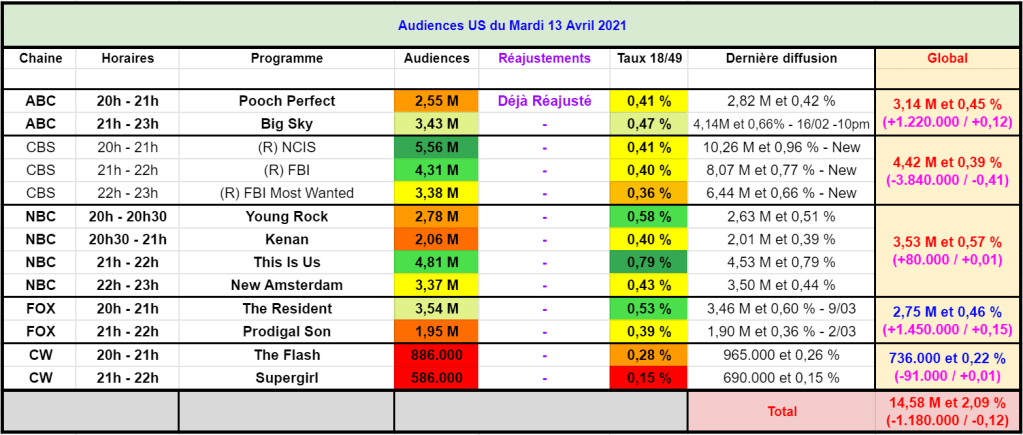 Sur NBC, Young Rock est en hausse avec 2,78 M et 0,58 % – Bon sur cible , cela reste pas terrible en audience pour moi.