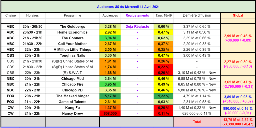 Ensuite, les 2 relances de United States of Al attirent 1,91 M et 1,74 M (0,26% / 0,22%). La relance de SWAT – renouvelée pour une saison 5 par CBS ! – rassemble 1,68 M et 0,20 % – Très faible sur taux mais ca n’a pas d’importance vu que c’est une rediffusion.
