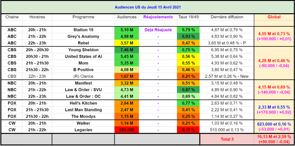 Sur CBS, Yong Sheldon est en forte hausse avec 7,46 M et 0,75 % – Très forte audience, la meilleure de la soirée. Ensuite, United States of Al est encore en hausse pour sa 3e semaine avec 5,45 M et 0,56 %.