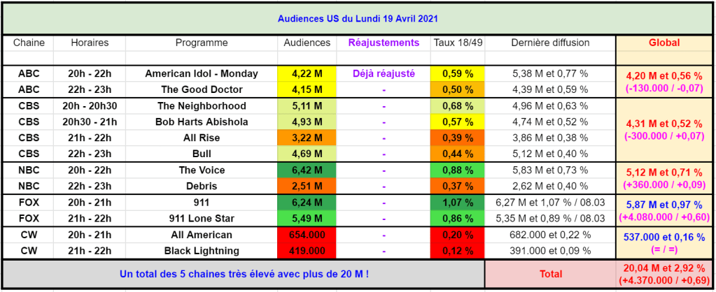 En ce lundi, American Idol a plongé de 1,16 M en une semaine avec 4,22 M et 0,59 % – Derrière, The Good Doctor rassemble 4,15 M et 0,50 % – En baisse par rapport au dernier épisode d’il y a 2 semaines.