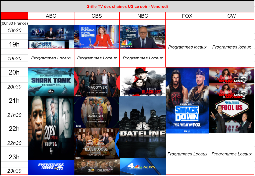Sur CBS, la relance de MacGyver attire 3,16 M et 0,30 % – Celle de Magnum attire 3,46 M et 0,32 % et celle de Blue Bloods rassemble 3,69 M et 0,31 % – De bonnes audiences pour des rediffusions.