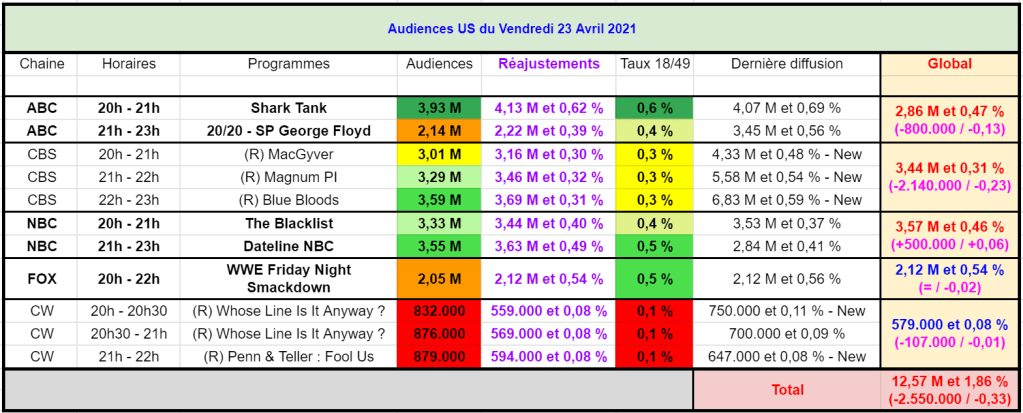 Sur ABC, Shark Tank – en l’absence de séries inédites sur CBS – signa le meilleure audience et le meilleur taux de la soirée avec 4,13 M et 0,62 % – En hausse sur une semaine en audience.