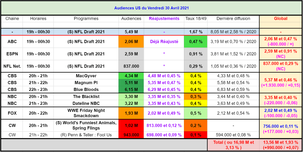 Même tendance pour ESPN avec 2,59 M et 0,91 % et pour NFL Network avec 837.000 et 0,29 %