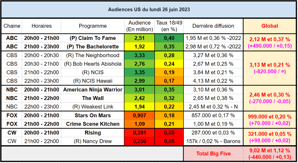 Sur NBC, Ninja Warrior se maintient toujours au dessus des 3M. The Wall perd quelques téléspectateurs avec 2,42 M – Weakest Link était en rediff ce lundi.