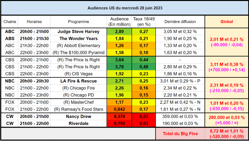 Sur CBS, les rediffusions de The Prie Is Right signent d’excellents scores avec 3,64 M / 0,44 % et 3,78 M/ 0,48 %