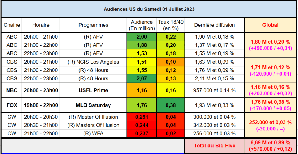 En ce samedi soir, ABC a rassemblé 2,00 M / 1,88 M / 1,53 M avec les rediffusions de AFV. ABC se classe leader sur l’ensemble de la soirée.