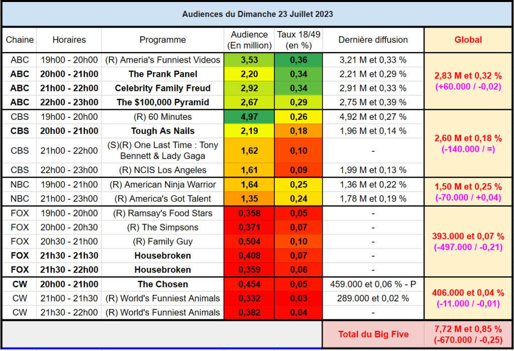 The Prank Panel avec 2,20 M / 0,34 %, Celebrity Family Feud avec 2,92 M / 0,34 % et The $100,000 Pyramid avec 2,67 M et 0,29 % sont quasi stable sur une semaine et signent des scores corrects.