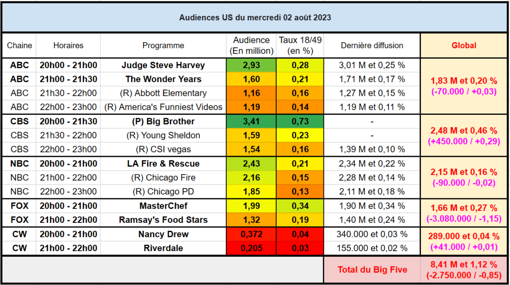 Sur ABC, Judge Steve Harvey est en légère baisse et repasse sous les 3M avec 2,93 M et 0,28 % – Le score reste bon.