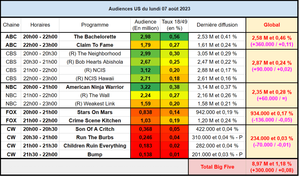Ensuite, Crime Scene Kitchen est aussi en baisse avec seulement 1,03 M et 0,19 % – C’est vraiment faible