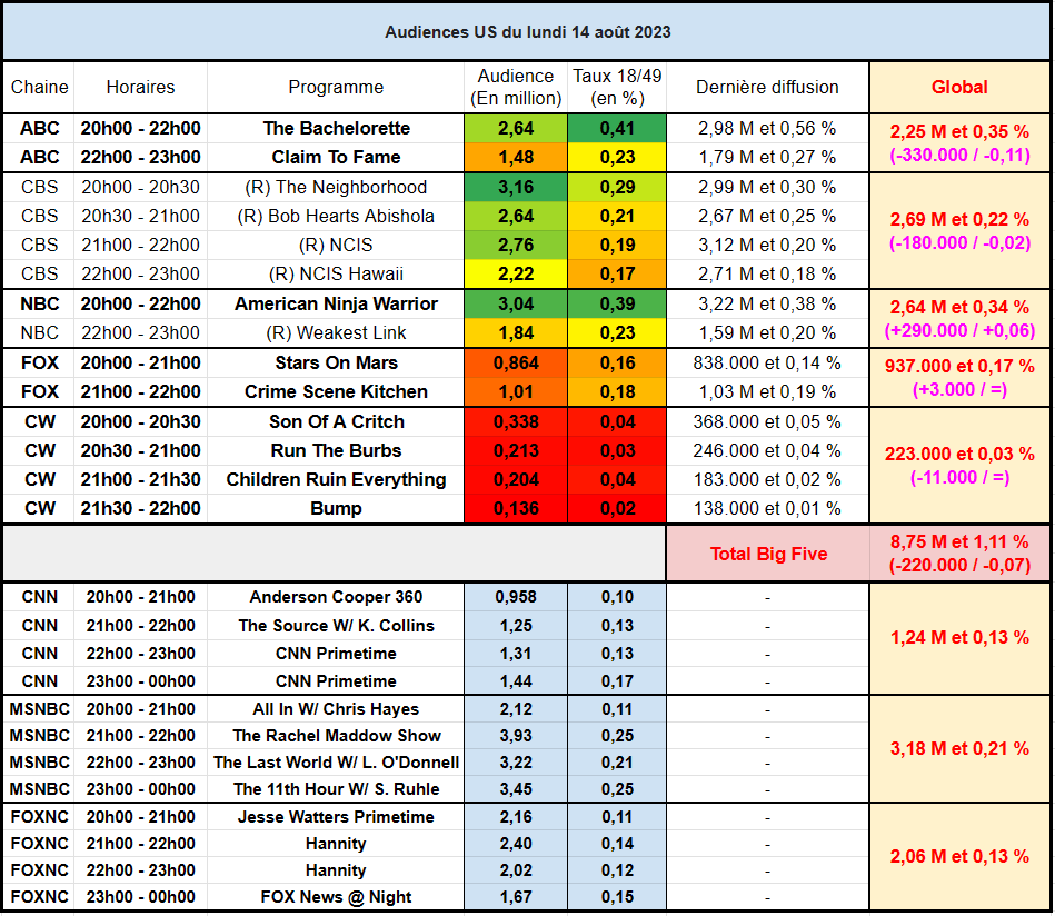 On commence par ce qui n’arrive pas souvent, MSNBC est leader national ce lundi soir. La chaine info du groupe NBC Universal, portée par l’inculpation de Donald Trump en Géorgie attire 3,18 M et 0,21 % en moyenne sur 20h/00h