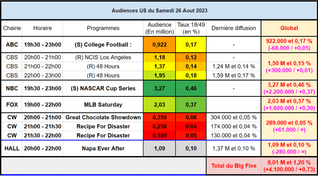 Sur NBC, la course NASCAR signe une belle audience avec 3,27 M et 0,46 % – C’est la meilleure audience et le meilleur score cible de la soirée. NBC se classe leader ce samedi soir.
