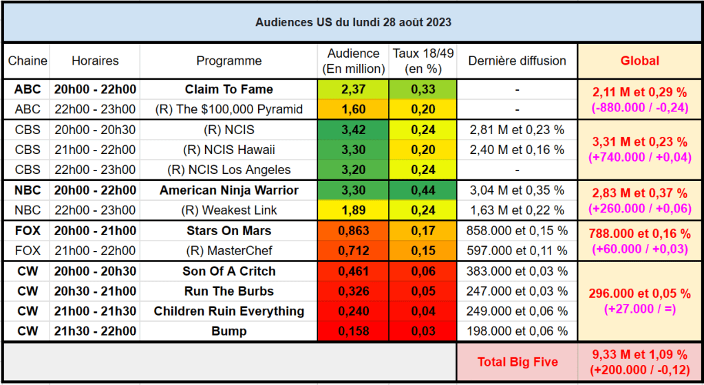 Audiences US du Lundi 28.08.23 : Le triple crossover NCIS domine la soirée. American Ninja Warrior en hausse. Stars On Mars très faible. Thomas Fusil Communiqués Audiences US 2 septembre 2023 1 Minute Voici les audiences de la soirée du 28 Aout Partager : Partager sur X(ouvre dans une nouvelle fenêtre) X Partager sur Facebook(ouvre dans une nouvelle fenêtre) Facebook J’aime chargement… Similaire Publié par Thomas Fusil Voir tous les articles par Thomas Fusil Publié 2 septembre 2023