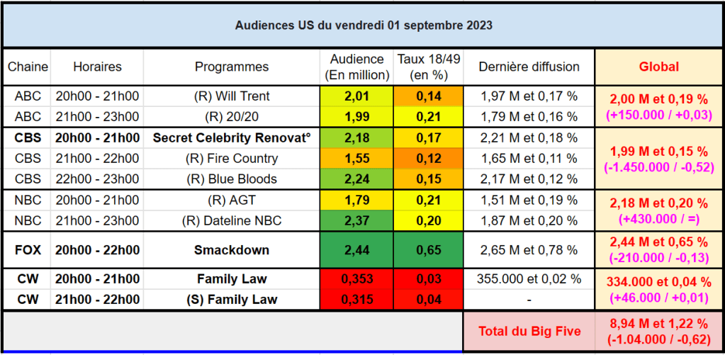 Audiences US du Vendredi 01.09.23 : Smackdown très bon leader sur FOX. Dateline en forte hausse. Thomas Fusil Communiqués Audiences US 6 septembre 20236 septembre 2023 1 Minute Voici les audiences de la soirée du 1er Septembre Partager : Partager sur X(ouvre dans une nouvelle fenêtre) X Partager sur Facebook(ouvre dans une nouvelle fenêtre) Facebook J’aime chargement… Similaire Publié par Thomas Fusil Voir tous les articles par Thomas Fusil Publié 6 septembre 20236 septembre 2023
