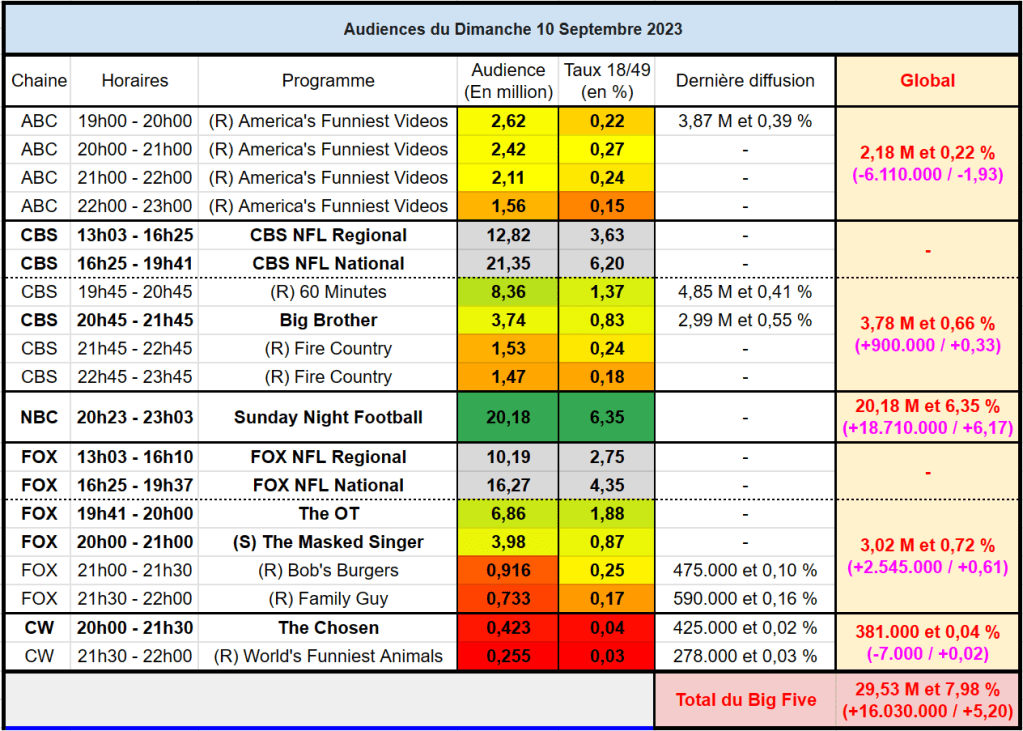 Audiences US du Dimanche 10.09.23 : Carton pour Sunday Night Football et 60 Minutes en prime. Thomas Fusil Communiqués Audiences US 13 septembre 202313 septembre 2023 1 Minute Voici les audiences de la soirée du 10 Septembre Partager : Partager sur X(ouvre dans une nouvelle fenêtre) X Partager sur Facebook(ouvre dans une nouvelle fenêtre) Facebook J’aime chargement… Similaire Publié par Thomas Fusil Voir tous les articles par Thomas Fusil Publié 13 septembre 202313 septembre 2023