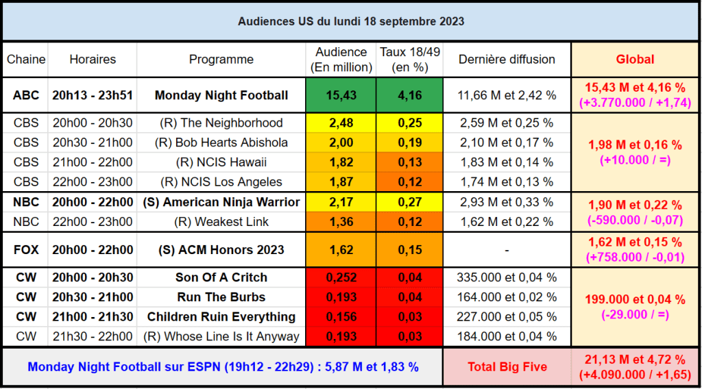 Audiences du Lundi 18.09.23 : Monday Night Football écrase la concurrence sur ABC. Les autres chaines sous les 2M en moyenne. Thomas Fusil Communiqués Audiences US 21 septembre 202321 septembre 2023 1 Minute Voici les audiences de la soirée du 18 Septembre Partager : Partager sur X(ouvre dans une nouvelle fenêtre) X Partager sur Facebook(ouvre dans une nouvelle fenêtre) Facebook J’aime chargement… Similaire Publié par Thomas Fusil Voir tous les articles par Thomas Fusil Publié 21 septembre 202321 septembre 2023