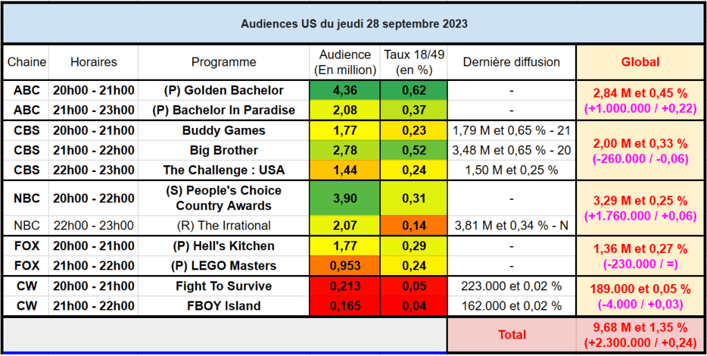Audiences US du Jeudi 28.09.23 : Carton pour le lancement de Golden Bachelor sur ABC. Bon score pour les People’s Choice Country Awards sur NBC. FOX faible. Thomas Fusil Communiqués Audiences US 30 septembre 202330 septembre 2023 1 Minute Voici les audiences de la soirée du 28 Septembre Partager : Partager sur X(ouvre dans une nouvelle fenêtre) X Partager sur Facebook(ouvre dans une nouvelle fenêtre) Facebook J’aime chargement… Similaire Publié par Thomas Fusil Voir tous les articles par Thomas Fusil Publié 30 septembre 202330 septembre 2023