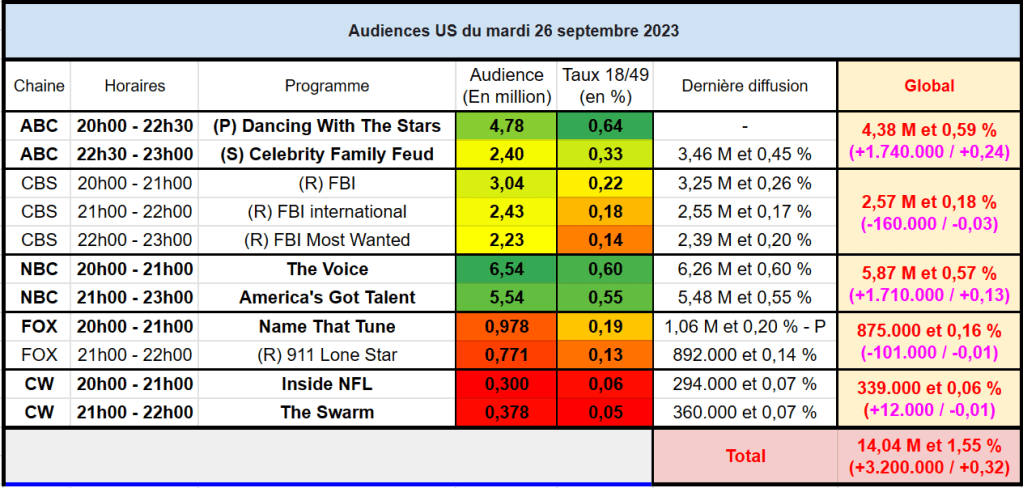 Audiences US du Mardi 26.09.23 : Carton pour The Voice sur NBC. Scores solides pour Dancing With The Stars et AGT. FOX faible. Thomas Fusil Communiqués Audiences US 30 septembre 202330 septembre 2023 1 Minute Voici les audiences de la soirée du 26 Septembre Partager : Partager sur X(ouvre dans une nouvelle fenêtre) X Partager sur Facebook(ouvre dans une nouvelle fenêtre) Facebook J’aime chargement… Similaire Publié par Thomas Fusil Voir tous les articles par Thomas Fusil Publié 30 septembre 202330 septembre 2023
