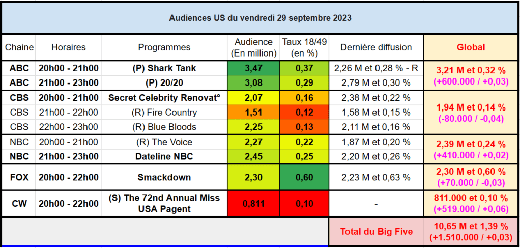 Audiences US du Vendredi 29.09.23 : Shark Tank et 20/20 brillent sur ABC. CW en forme avec Miss USA. CBS sous les 2M. Thomas Fusil Communiqués Audiences US 4 octobre 20234 octobre 2023 1 Minute Voici les audiences de la soirée du 29 Septembre Partager : Partager sur X(ouvre dans une nouvelle fenêtre) X Partager sur Facebook(ouvre dans une nouvelle fenêtre) Facebook J’aime chargement… Similaire Publié par Thomas Fusil Voir tous les articles par Thomas Fusil Publié 4 octobre 20234 octobre 2023