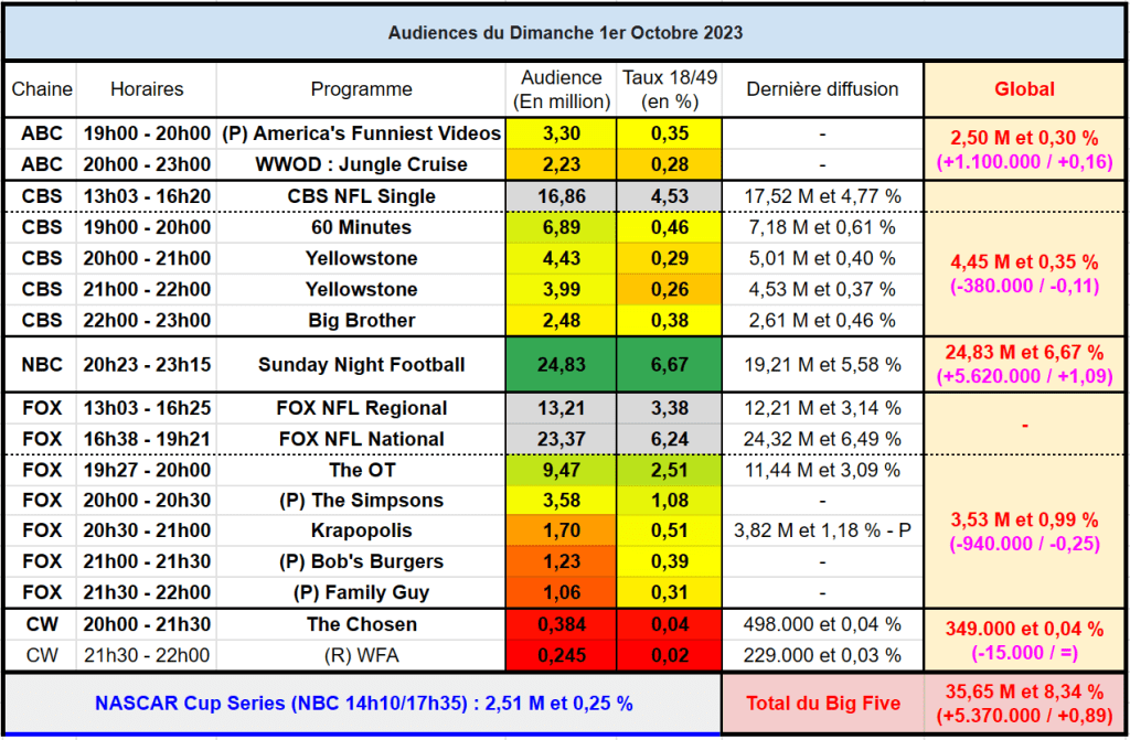 Audiences US du Dimanche 01.10.23 : Gros carton pour la NFL sur NBC. Très bon score pour le lancement de The Simpsons sur FOX. Thomas Fusil Communiqués Audiences US 7 octobre 20237 octobre 2023 1 Minute Voici les audiences de la soirée du 1er Octobre Partager : Partager sur X(ouvre dans une nouvelle fenêtre) X Partager sur Facebook(ouvre dans une nouvelle fenêtre) Facebook J’aime chargement… Similaire Publié par Thomas Fusil Voir tous les articles par Thomas Fusil Publié 7 octobre 20237 octobre 2023